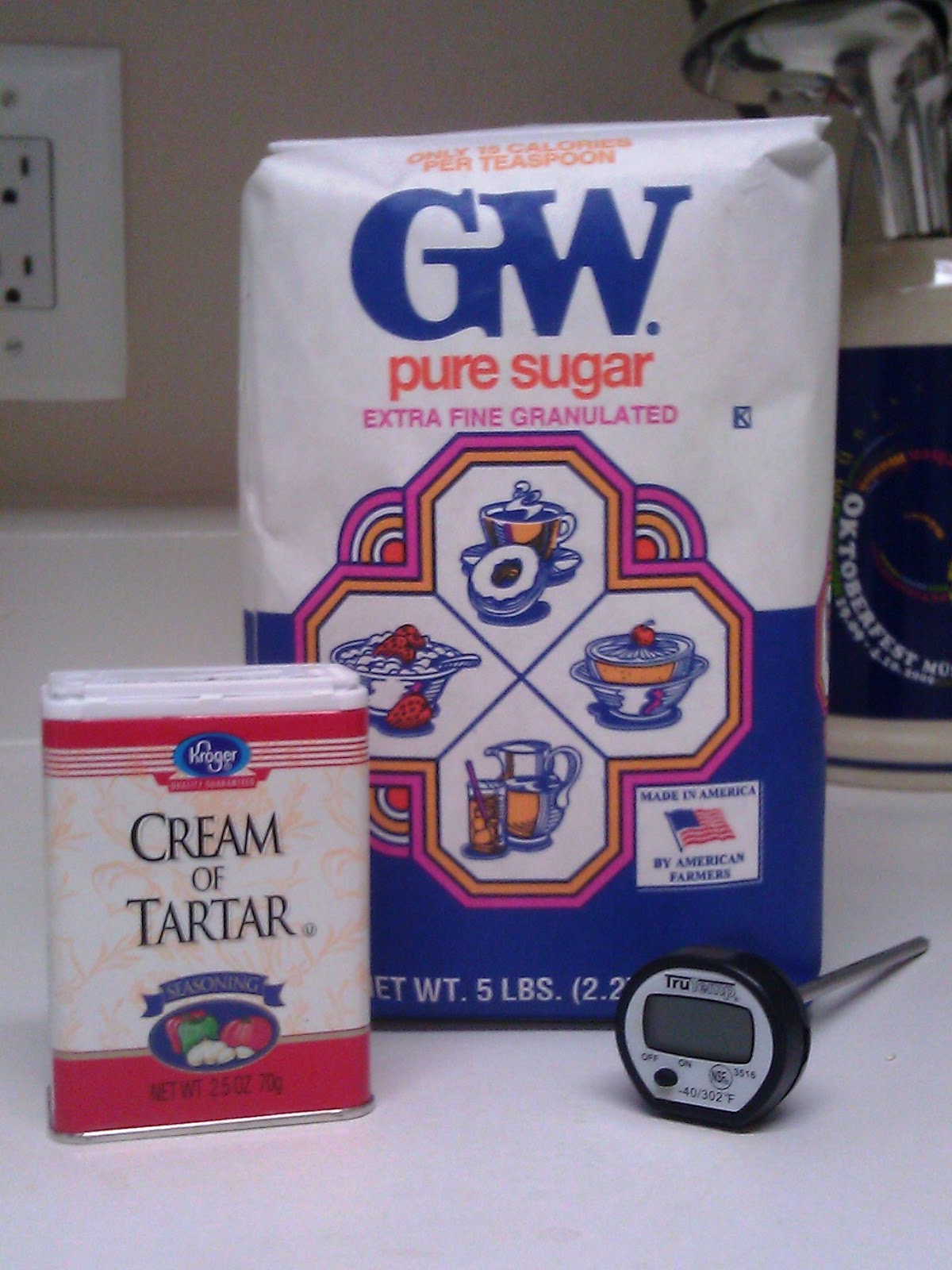 After a bit of research, it turns out to be a pretty simple and inexpensive process. In addition to a pot and spoon, all it takes is sugar, water, cream of tartar, a candy thermometer, a cookie sheet, aluminum foil or parchment paper, plus a little time. More importantly, the finished product will cost less than a $1.00 a pound.